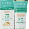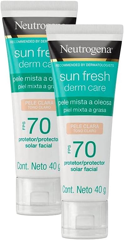 Kit 2 Protetor Solar Sun Fresh Oily Skin Pele Clara FPS 70 Sun Fresh Derm Care Facial FPS 70 possui textura levinha e sequinha que não derrete. A excluisva tecnologia HELIOPLEXXP oferece muito alta proteção ampla e eficaz contra os raios UVB, UVA e ajuda a proteger contra a luz visível. – Com sílica que atua na oleosidade da pele – Efeito base que cobre imperfeições – Complexo antiodixante rejuvenescedor formado por: – Niacinamida: ativo clareador de sinais causados pelo sol; – Feverfew: poderoso antioxidante; – Vitamina C: antioxidante – Dermatologicamente testado. Não comedogênico e não obstrui poros * Kit Contém: 2 Protetor Solar Sun Fresh Oily Skin Pele Clara FPS 70 cada * Compre produtos