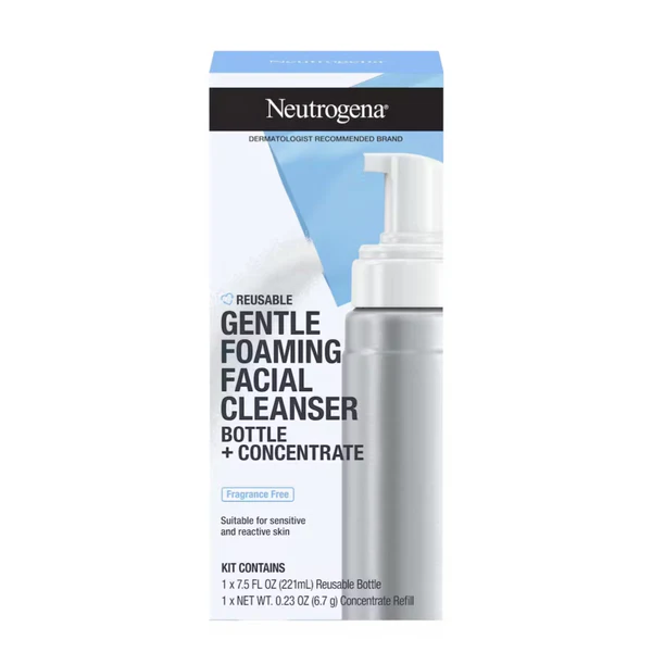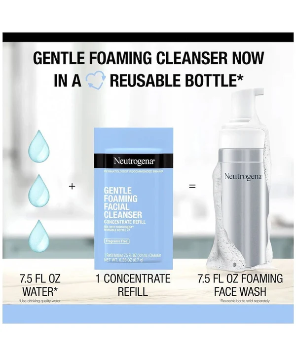 Elimine os agressores diários para uma pele instantaneamente renovada e reabastecida com o Kit Inicial de Limpeza Facial de Espuma Suave Reutilizável da . Este kit de uma marca de cuidados com a pele recomendada por dermatologistas vem com um frasco reutilizável e recarga de concentrado de limpeza facial espumante sem fragrância para dissolver suavemente os agressores diários, como sujeira, óleo e maquiagem. Formulado com apenas sete ingredientes, o gel de limpeza facial cria uma espuma rica e macia que limpa suavemente e é adequado para peles sensíveis e reativas. A fórmula de enxágue limpo e 96% biodegradável é sem perfume, não comedogênica e livre de parabenos, ftalatos, sulfatos, álcool, óleo mineral e sabão. Para usar, remova a bomba do frasco reutilizável , encha com água e despeje a mistura concentrada. Agite bem o frasco antes do primeiro uso e quando terminar,