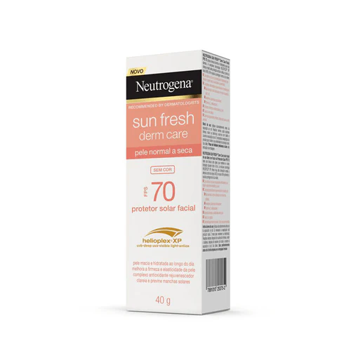 O que é e para que serve? O Protetor Solar Facial Para Pele Seca Sun FreshDerm Care Com Cor FPS 70, 40g, possui textura ultraleve e hidratante que não derrete e oferece alta proteção contra os raios UVA, UVB e ajuda a proteger contra a luz visível com sua exclusiva tecnologia HELIOPLEX® XP. Com ativos ricos em propriedades hidratantes que deixam a pele macia, aveludada e preenchida e complexo antioxidante rejuvenescedor formado por Niacinamida, ativo clareador de sinais causados pelo sol, Feverfew e Vitamina C, poderosos antioxidantes. Melhora a firmeza e elasticidade da pele e possui textura não oleosa. Dermatologicamente testado e adequado para peles sensíveis. Benefícios e diferenciais Fórmula que não derrete/escorre com suor e umidade; Deixa a pele aveludada e macia; Devolve o brilho natural da pele saudável; Melhora a firmeza e elasticidade da pele; Deixa a sensação prolongada de pele hidratada; Testado e aprovado para a pele sensível. Como usar Aplique abundantemente antes da exposição ao sol. Reaplicar sempre, após sudorese intensa, nadar ou banhar-se, secar-se com toalha e durante a exposição ao sol. É necessária a reaplicação do produto para manter a sua efetividade de proteção solar. Uso diário. Composição Substâncias Ativas: Feverfew, Niacinamida (Nicotinamida, B3), Vitamina C , VIT E, Ethylhexyl Triazone, Octocrylene, Ethylhexyl Salicylate, Bis-Ethylhexyloxyphenol Methoxyphenyl Triazine, Homosalate, Butyl Methoxydibenzoylmethane. Precauções Se a quantidade aplicada não for adequada, o nível de proteção será significativamente reduzido. Ajuda a prevenir as queimaduras solares, mas não oferece nenhuma proteção contra a insolação. Evite exposição prolongada das crianças ao sol. Produto de uso adulto. Evite contato com os olhos. Caso isso aconteça, enxágue-os com água em abundância. Em contato com tecido pode causar manchas. Conservar em local fresco e ao abrigo da luz solar direta.